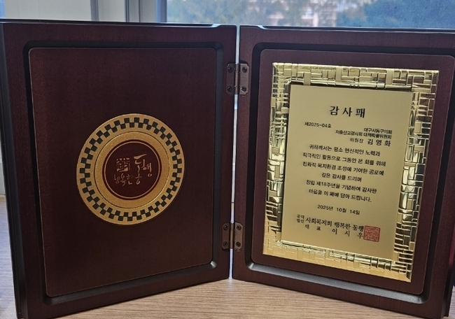 [ 더타임즈 마태식 기자 ] 대구광역시 동구의회 경제복지위원회 소속 김영화 의원(국민의힘, 신암5동·지저동·동촌동)이 지난 10월 28일 (사)한국유권자중앙회가 주관한 ‘2025 지방자치의정대상’ 의정활동 부문 대상을 수상했다.