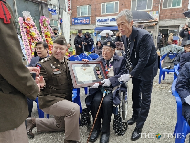 <미군 관계자가 워커대장기념사업회 김리진회장에게 감사패를 전달하고 있다. 김리진 회장은 현재 101세. 평소에 "은혜를 받았으면 잊어서는 안된다"고 했고 ,그래서 사비를 들여 여태 기념사업회를 이끌어 왔다.