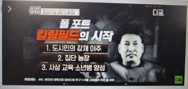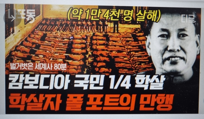(캄보디아를 공산화 시킨 후 많은 사람을 살해한 폴포트. 그것을 킬링필드라고 하고 이 사진에서는 폴포트가 약 1만 4천명 살해 했다는데 실제 통계는 150만~200만명을 살해 했다고 한다. )