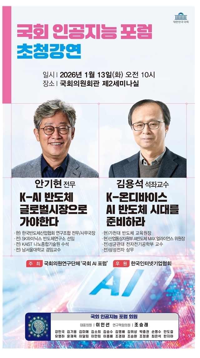 강연에는 국내 AI·반도체 분야를 대표하는 전문가들이 연사로 참여한다. 안기현 한국반도체산업협회 연구조합 전무는 ‘K-AI 반도체, 글로벌 시장으로 가야 한다’를 주제로 글로벌 AI 반도체 시장의 구조 변화와 우리 산업이 직면한 기회와 과제를 진단한다.