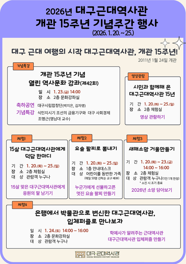 체험 프로그램도 다채롭다. 관람객 누구나 참여할 수 있는 ‘15살 대구근대역사관에게 덕담 한마디’, 어린이·가족 대상 ‘요술팔찌로 뽐내기’, ‘새해 소망 거울 만들기’, ‘은행에서 박물관으로 변신한 대구근대역사관 입체퍼즐 만들기’ 등이 운영된다. 모든 체험은 무료이며, 사전 신청 없이 현장 참여가 가능하다.
