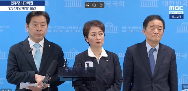 이언주·황명선·강득구 최고위원은 23일 공동 기자회견을 열고, “진짜 통합을 말하려면 그 방식부터 민주적이어야 한다”며 “제대로 된 통합을 위해서라도 정청래식 독단은 이제 끝나야 한다”고 밝혔다.