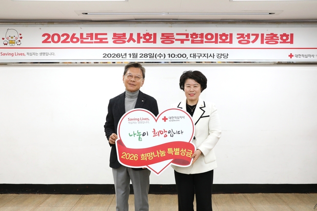 [ 더타임즈 마태식 기자 ] 대구 동구의회는 지난 28일 열린 2026년도 대한적십자사 봉사회 대구 동구지구협의회 정기총회에 참석해 지역 사회를 위해 헌신해 온 적십자 봉사원들을 격려하고, 적십자 특별회비 50만 원을 전달했다.