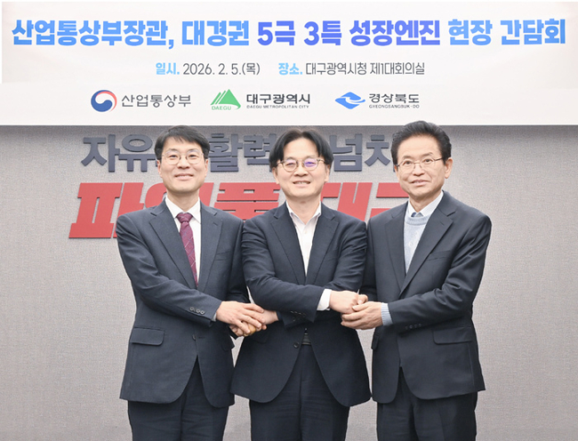 대구광역시는 2월 5일 대구시청 산격청사에서 ‘대경권 5극 3특 성장엔진 전략산업 현장간담회’를 개최했다고 밝혔다. 이날 간담회는 김정관 산업통상부 장관 주재로 열렸으며, 김정기 대구광역시장 권한대행과 이철우 경상북도지사가 참석해 대경권 성장엔진 육성 전략과 주요 현안을 논의했다.