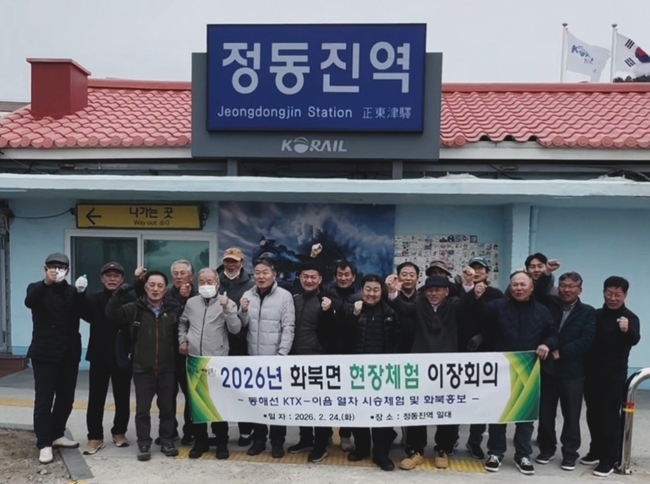 이날 이장들과 직원들은 동해선(강릉~부전) KTX-이음 개통을 기념해 열차를 직접 시승하며 해돋이와 겨울 여행 명소인 정동진역까지 이동했다. 이어 정동진역 해변·모래시계공원 견학, 황태·더덕구이 등 지역 먹거리 체험, 레일바이크 시승 등 현장 체험을 통해 화북면에 적용할 수 있는 관광 활성화 방안에 대해 의견을 교환하는 소중한 시간을 가졌다.
