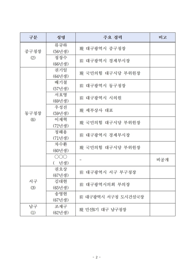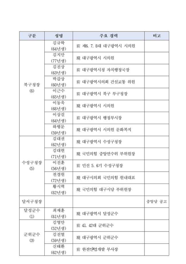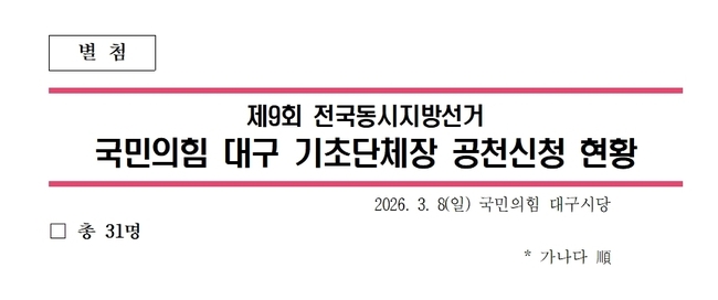 대구시당은 공천신청 접수 현황을 별첨 자료를 통해 공개했으며, 이날 오후 6시 기준 접수된 기초단체장 공천 신청 현황을 집계해 발표했다.