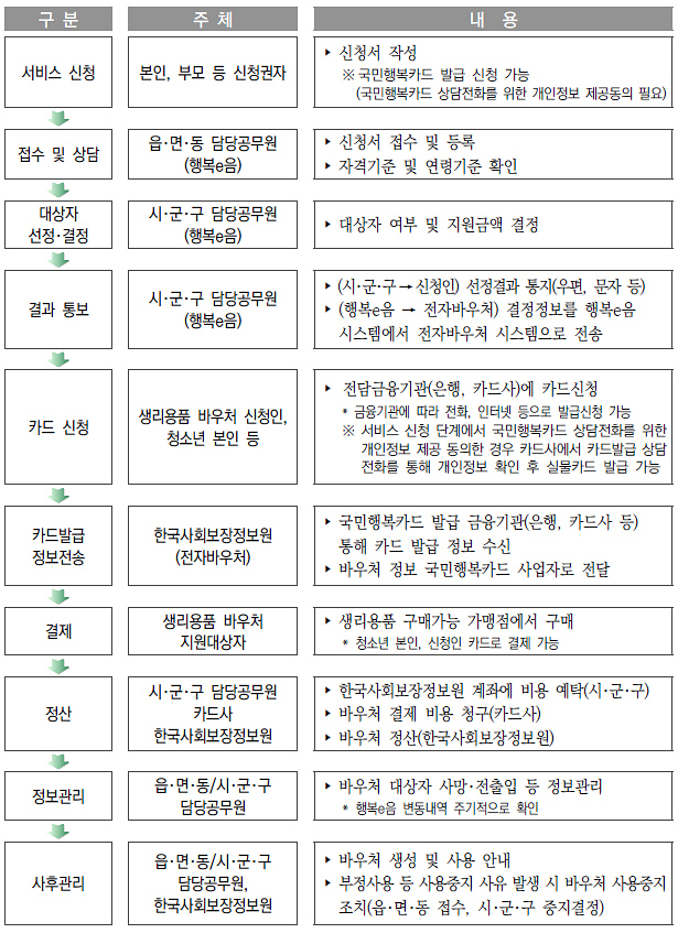 지원금은 국민행복카드를 통해 카드사별 지정 온·오프라인 유통점에서 생리용품 구매에 사용할 수 있으며, 올해 지급된 바우처는 12월 31일까지 사용해야 한다.