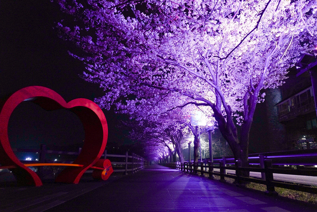 특히 야간에는 형형색색의 화려한 조명이 벚꽃을 은은하게 비추며 낮과는 또 다른 낭만적인 분위기를 자아낸다.