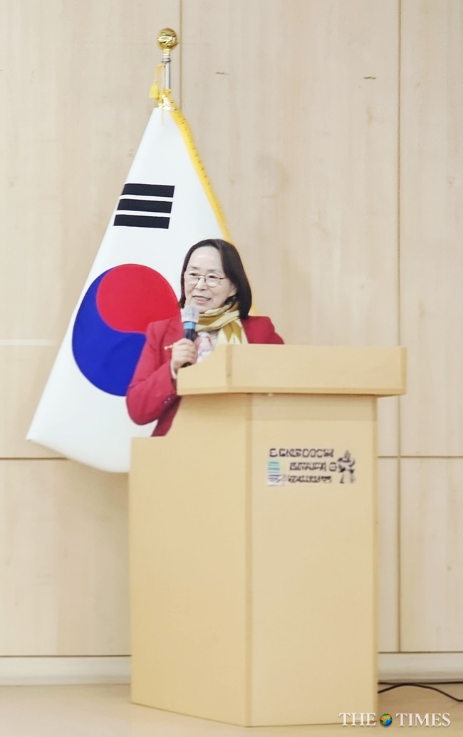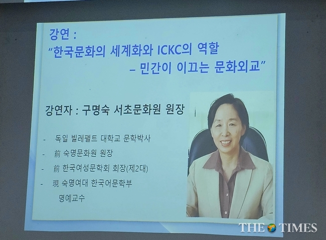 <한국문화의 세계화와 ICKC의 역할 – 민간이 이끄는 문화외교>를 주제로 강연하는 구명숙 서초문화원장(숙명여대 한국어문학부 명예교수) >