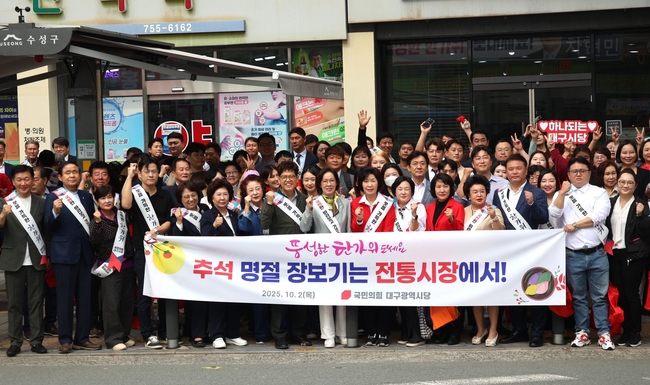 이날 행사에는 이인선 대구시당 위원장을 비롯해 부위원장단, 대변인단, 상설위원회 관계자 등 80여 명이 참석했다. 참가자들은 제수용품과 생필품을 직접 구입하며 상인들과 소통하고, 경기 침체와 소비 위축으로 어려움을 겪는 전통시장에 힘을 보태는 시간을 가졌다.