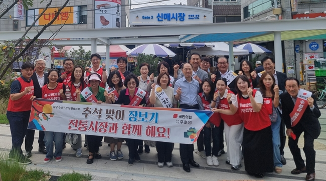 이번 행사에는 주호영 부의장, 김선희 여사를 비롯해 수성갑 당협 당원과 지방의원 등 50여 명이 함께 참여했으며, 명절 제수용품과 지역 농산물 등을 직접 구입하며 상인들과 소통의 시간을 가졌다.