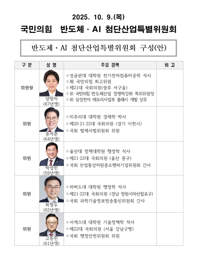양향자 위원장은 삼성전자 메모리사업부 최초의 여성 임원 출신으로, 국회 산업통상자원중소벤처기업위원회와 반도체산업특별위원회 활동을 통해 산업 현장과 정책 양면을 두루 경험한 인물이다. 이번 특위에는 국회 관련 상임위원회 소속 의원들과 학계·산업계 전문가들이 참여해 정·산·학 협력 체제를 공고히 했다.