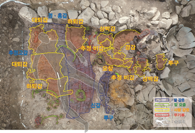 무덤에서는 사람과 말의 갑옷·투구 일체, 금동관 일부, 남성 장수의 인골, 순장된 시종 인골이 함께 나왔다.