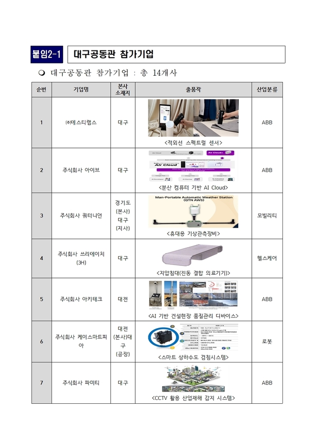 대구공동관 참가기업 및 혁신상 수상기업 리스트