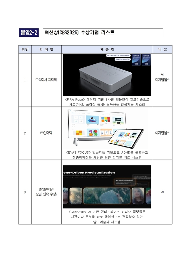 특히 CES 2026 혁신상 부문에서 대구기업 3개사가 수상하며 지역 기업의 기술 경쟁력과 글로벌 시장성을 입증했다. 수상 기업은 주식회사 파미티(레이더 기반 3차원 행동인식 AI), 인더텍(AI 기반 ADHD 디지털 치료 시스템), 일만백만(AI 기반 엔터프라이즈 비디오 플랫폼)이다.