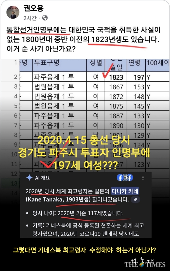 부정선거에 지대한 관심을 가진 권요용 변호사가 체크한 한국 거짓(부정선거의 현장)의 한 장면. 2020년 총선, 대한민국 선거에 대한민국 국적이 이닌 당시 1823년 생,조선의 백성 197세가 선거를 했다는 기록이 있다. 그 외 153세,148세, 이것은 해외 토픽 감이다. 이런 토픽이 어느 나라에서 니왔나? 한국, 대한민국에서 2020년 나왔다.)