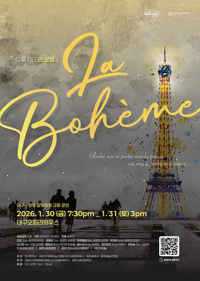 [ 더타임즈 마태식 기자 ] 대구문화예술진흥원 대구오페라하우스는 2026년 첫 공연으로 광주시립오페라단이 제작한 푸치니 오페라 라 보엠을 오는 1월 30일(금) 오후 7시 30분과 31일(토) 오후 3시, 대구오페라하우스에서 선보인다.