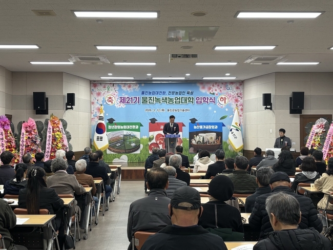 울진군은 울진 농업의 대전환과 미래농업을 선도할 전문농업인 양성을 위해‘제21기 울진녹색농업대학’입학식을 지난 3월 12일 개최하고 본격적인 교육과정 운영에 들어갔다.