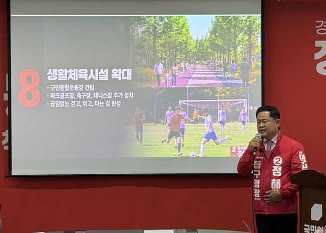 정 예비후보는 34만 동구 주민의 건강권 회복과 생활 여건 개선을 목표로, 지역 내 유휴부지를 활용한 체육시설 확충과 보행·자전거 네트워크 구축, 종합운동장 건립 등을 추진하겠다고 밝혔다.