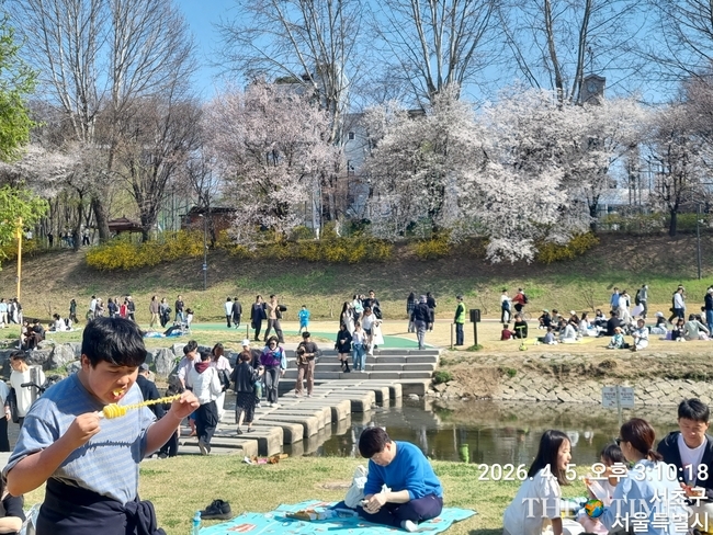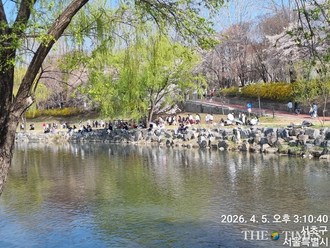 (봄을 맞아 양재천 주변에 평화롭게 앉아 있는 구민들)